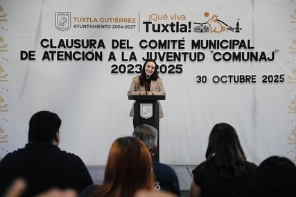 El presidente municipal Angel Torres encabezó la clausura del Comité Municipal de Atención a la Juventud (COMUNAJ), 2023-2025; asimismo, externó su felicitación a las y los integrantes salientes y les entregó un reconocimiento por sus propuestas e ideas que contribuyeron al desarrollo de la juventud tuxtleca.