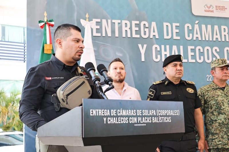Durante la entrega de cámaras de solapa (corporales) y chalecos con placas balísticas a elementos de la Secretaría de Seguridad del Pueblo (SSP), el gobernador Eduardo Ramírez Aguilar destacó que el gobierno de la Nueva ERA invierte de manera decidida en seguridad, con el propósito de dotar a las corporaciones policiales de equipamiento y herramientas tecnológicas que les permitan desempeñar en mejores condiciones las tareas de proximidad ciudadana, así como de prevención y combate de la delincuencia.