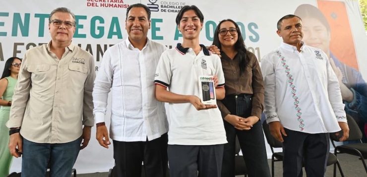 Durante la entrega de teléfonos celulares del programa Conecta Chiapas a estudiantes del Colegio de Bachilleres de Chiapas (Cobach), Plantel 01, en Tuxtla Gutiérrez, el gobernador Eduardo Ramírez Aguilar destacó que estos apoyos constituyen una herramienta tecnológica que facilitará sus actividades escolares y les permitirá mantenerse comunicados con sus familiares.