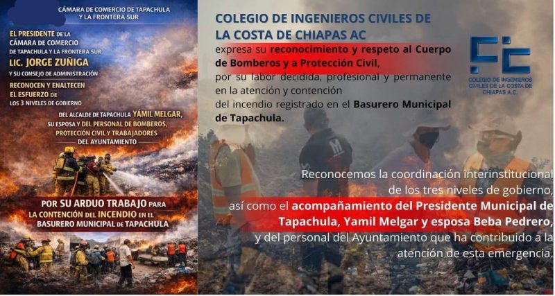 De igual forma, la Cámara de Comercio de Tapachula y Frontera Sur (Canaco), que encabeza Jorge Zúñiga, reconoció el trabajo realizado por el alcalde Yamil Melgar, su esposa Beba Pedrero, así como el esfuerzo permanente de bomberos, Protección Civil y trabajadores del Ayuntamiento por su ardua labor en la contención del incendio en el basurero municipal.