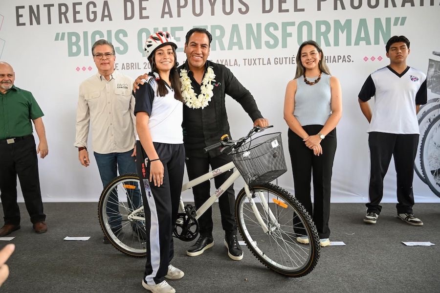 El gobernador Eduardo Ramírez Aguilar encabezó la entrega de apoyos del programa Bicis que Transforman a estudiantes de la Escuela Secundaria Técnica 64, ubicada en la colonia Plan de Ayala de Tuxtla Gutiérrez, en donde destacó que el gobierno de la Nueva ERA impulsa programas y acciones que contribuyan al bienestar, con el fin de favorecer un mejor desempeño escolar de la niñez y la juventud chiapaneca.