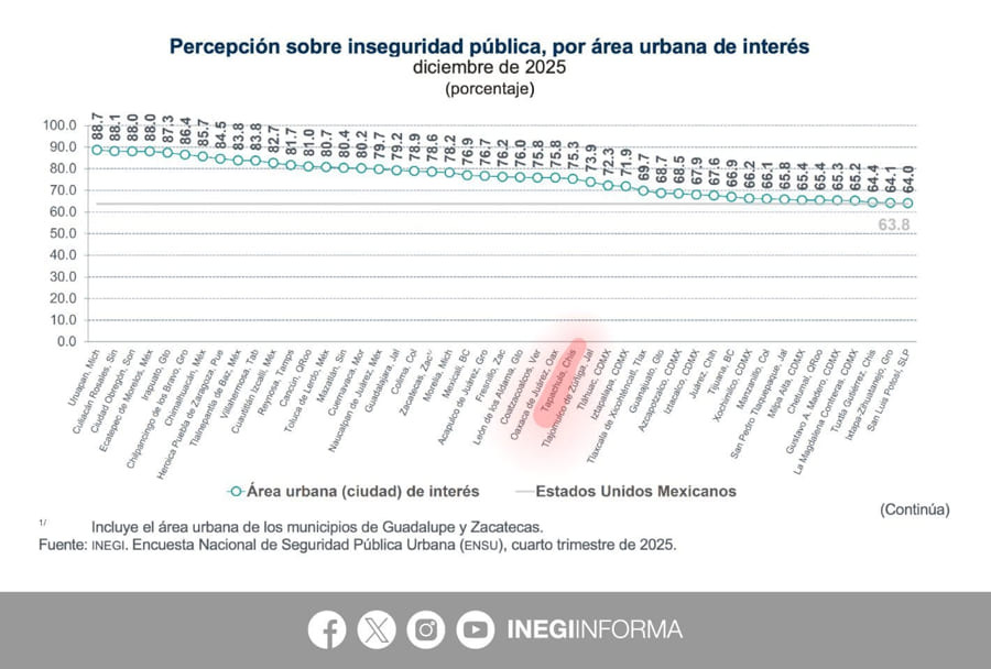 La reciente Encuesta Nacional de Seguridad Pública Urbana del Instituto Nacional de Estadística y Geografía (INEGI) sobre la percepción de inseguridad pública, reveló que Tapachula ha logrado un avance significativo en materia de seguridad, ubicándose en el lugar 28, lo que representa una gran disminución en comparación con el año pasado.